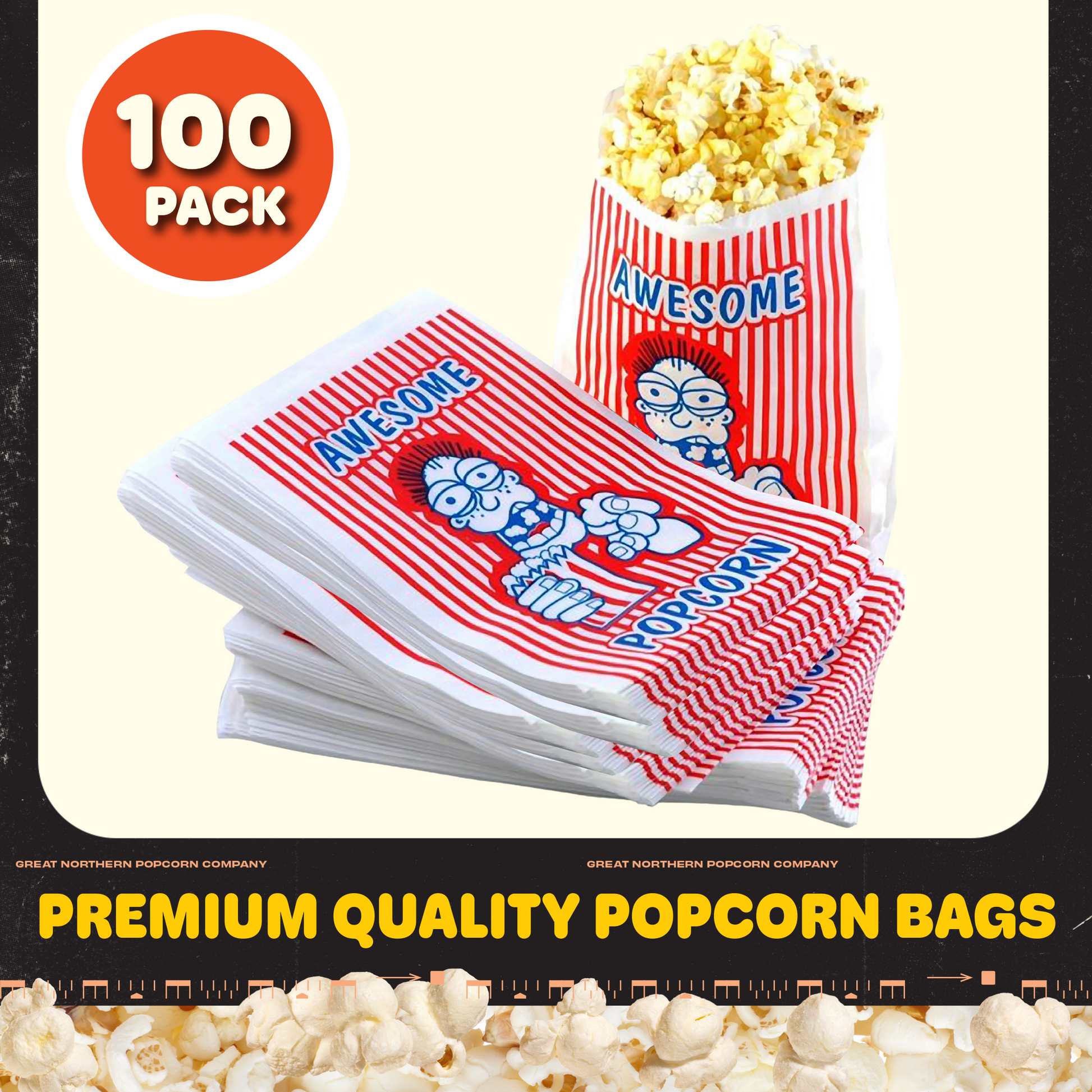 - These popcorn bags bulk case of 100 have an eye-catching red, white, and blue design with the Great Northern Popcorn Crunchy character on the front