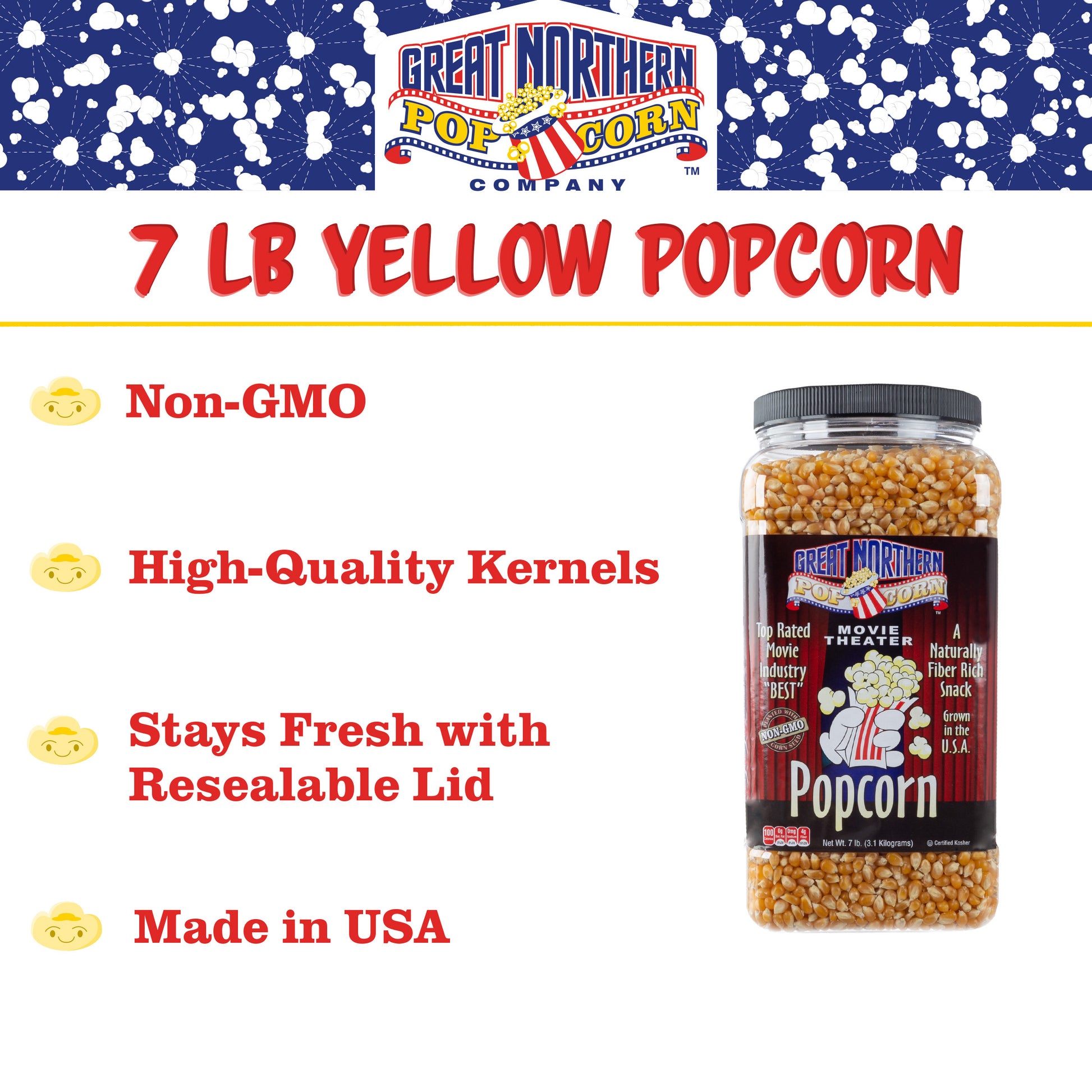 - This popcorn gift set includes a 7-pound bulk jug of USA-grown, non-GMO gourmet yellow popping kernels