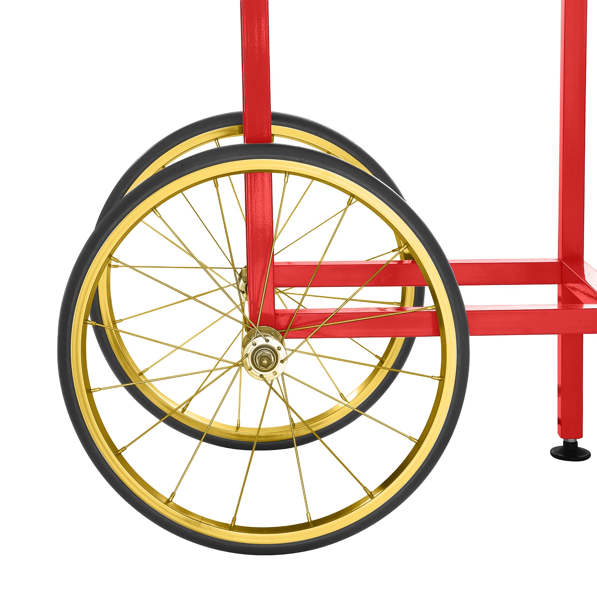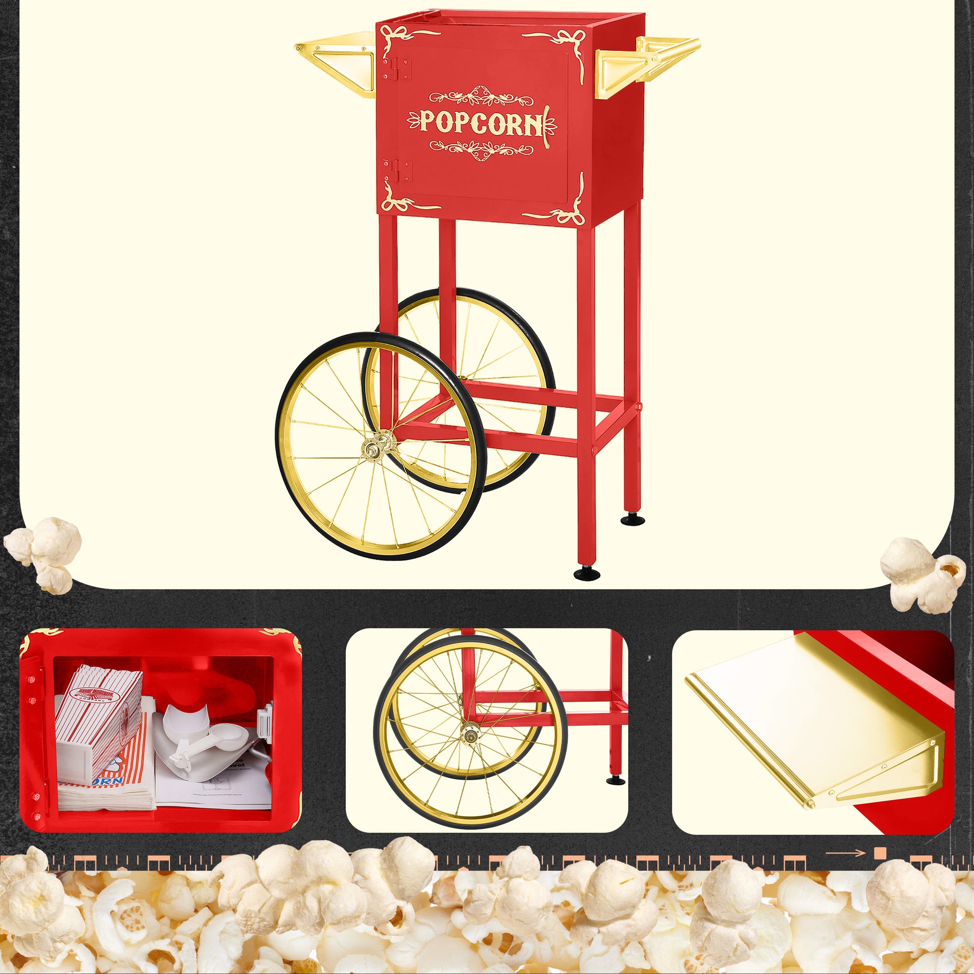 - The perfectly portable and detachable popcorn machine cart features 15.5in bicycle-style wheels, a storage cabinet, and a large working shelf