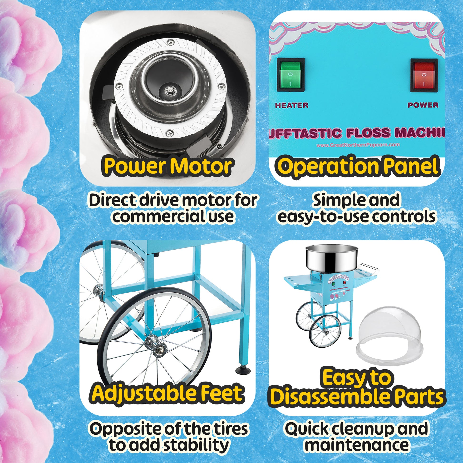 - This wheeled cotton candy machine cart allows you to produce fluffy clouds of deliciousness using sugar floss or hard candy