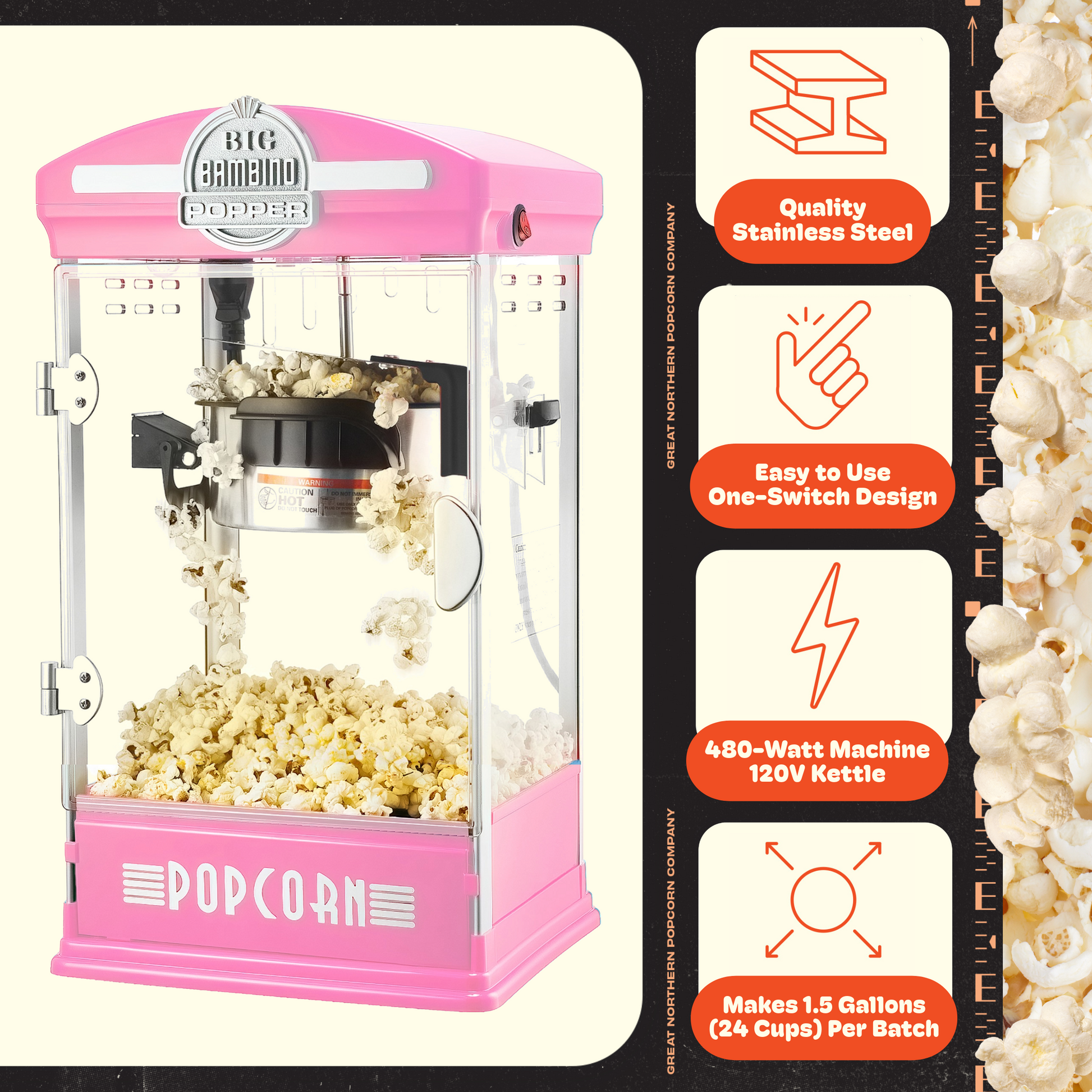- This 480W specialty kitchen appliance has an attractive design aimed to capture the look of movie theater popcorn machines while fitting easily on most counters