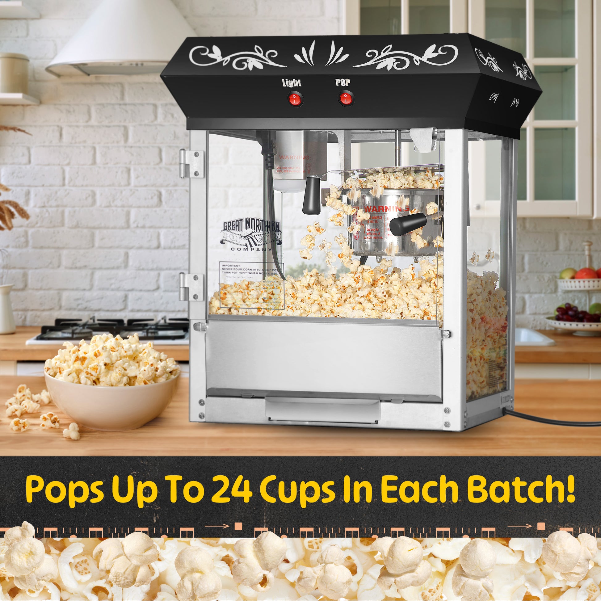 - This Great Northern Popcorn Machine has a stainless steel kettle to pop 1.5-gallons (24 cups) of popcorn in minutes