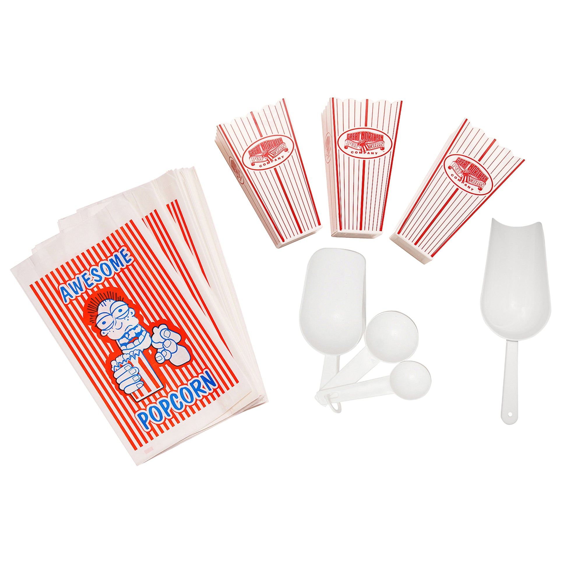 - Dimensions: (L) 17.1 x (W) 14.1 x (H) 20.6-inches; 29lbs; ETL-Approved, 120V, 640W; Electric Popcorn Popper Includes: 3 Plastic Cups, 25 Serving Bags, Measuring Cups, and Scoop