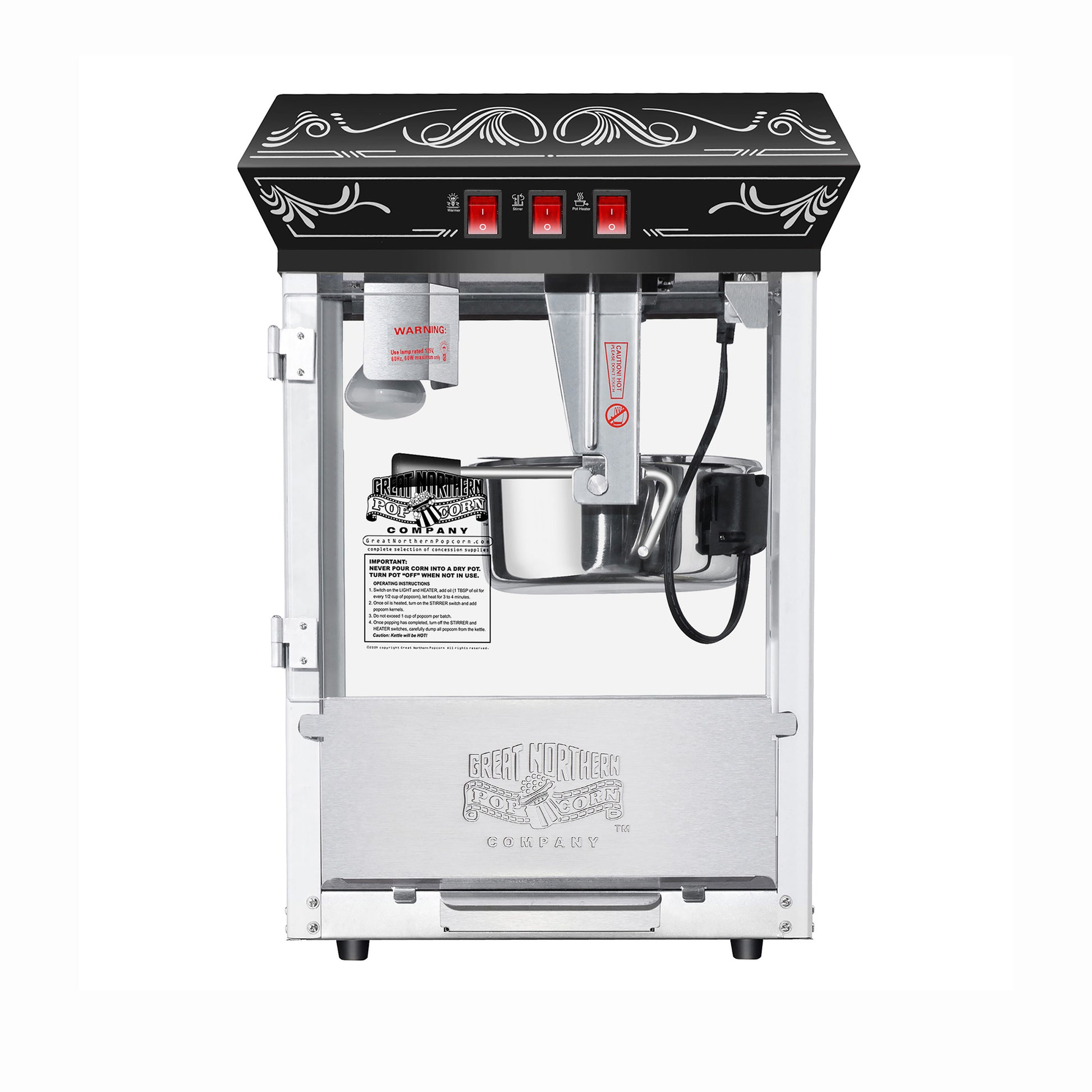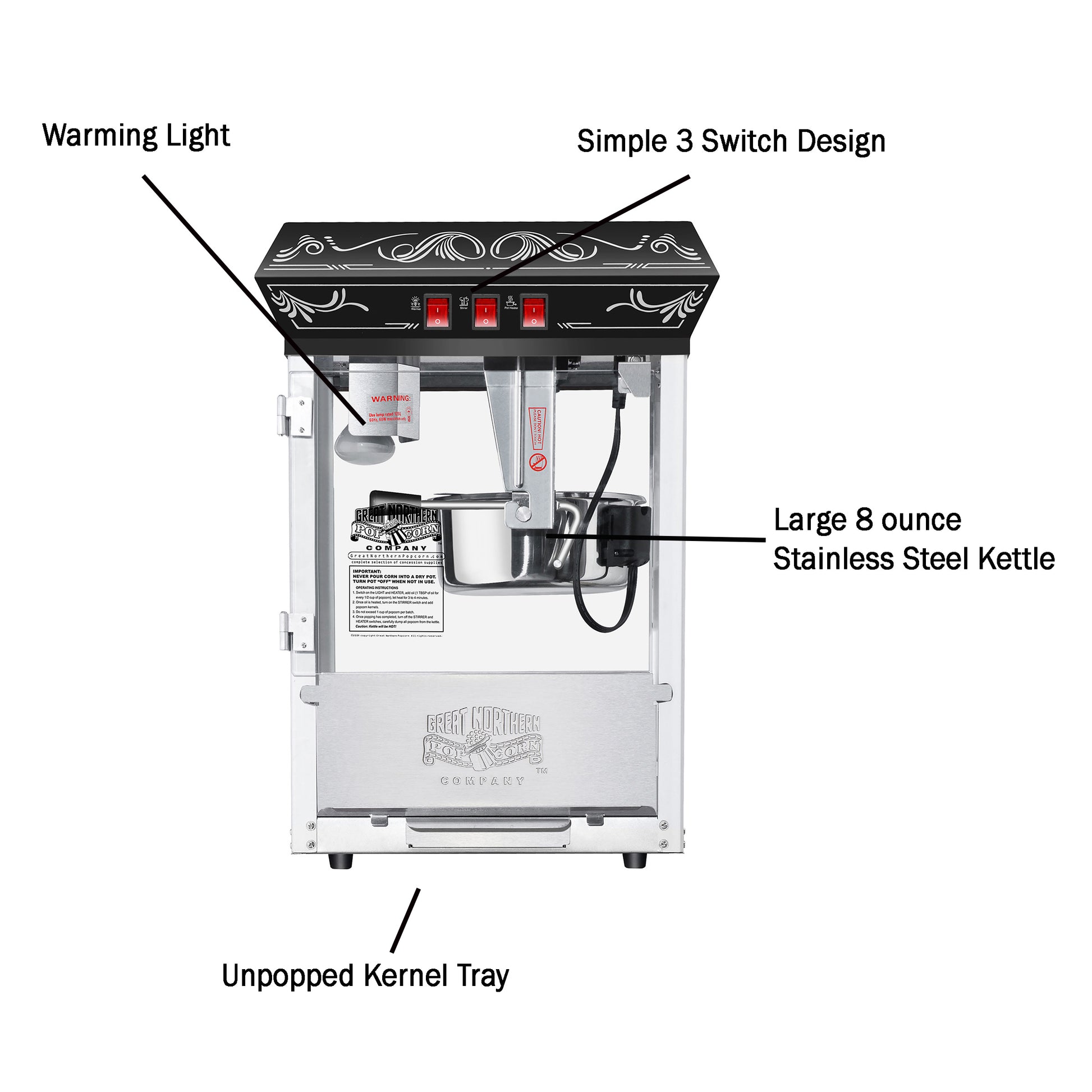 - The 3-switch design allows you to use the kettle heater and stirrer, overhead light, and warming deck independently of each other.