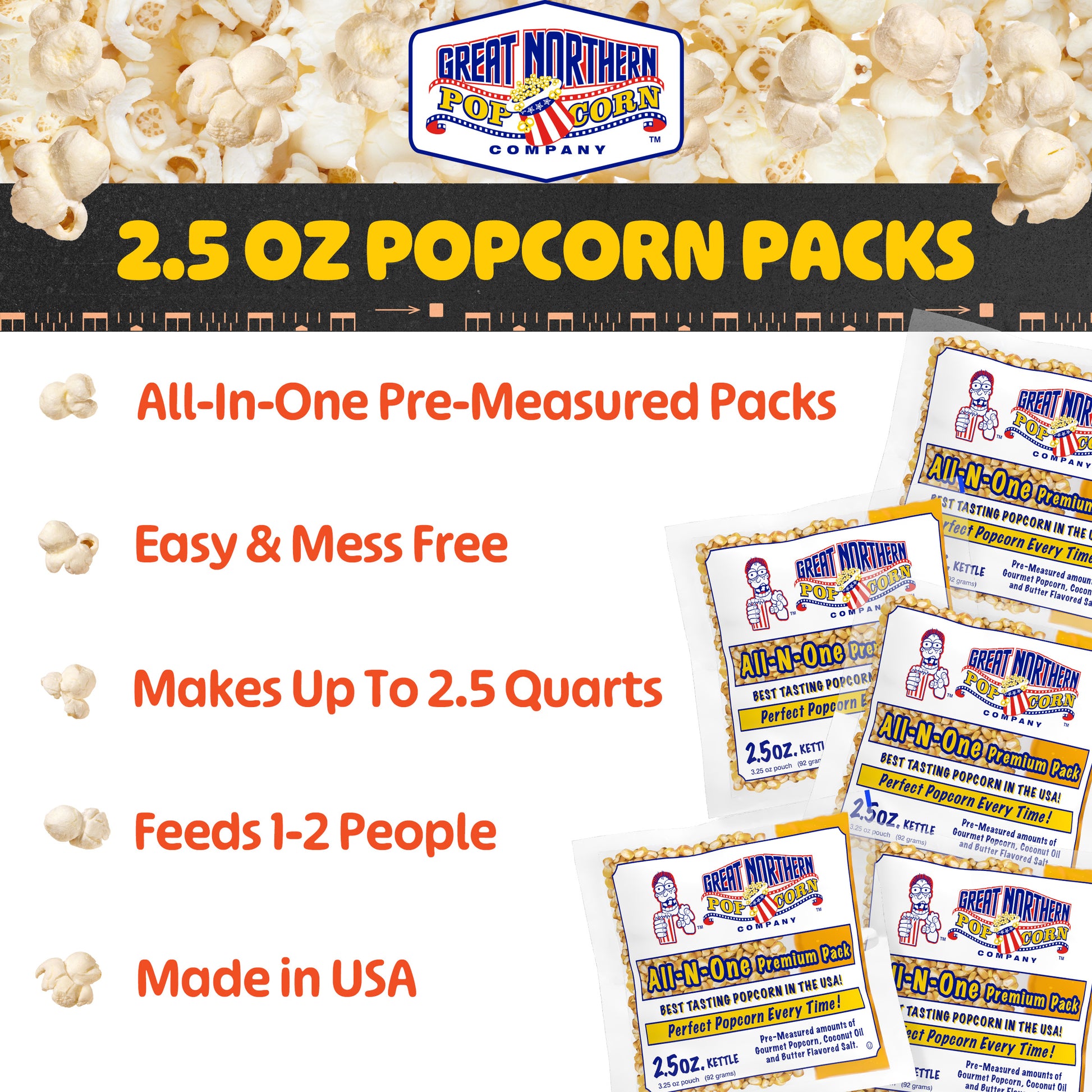 - Pair these 2.5-ounce popcorn packs with your popcorn maker equipped with a 2.5 to 3-ounce kettle for 3-quarts of piping hot snacks that feed two