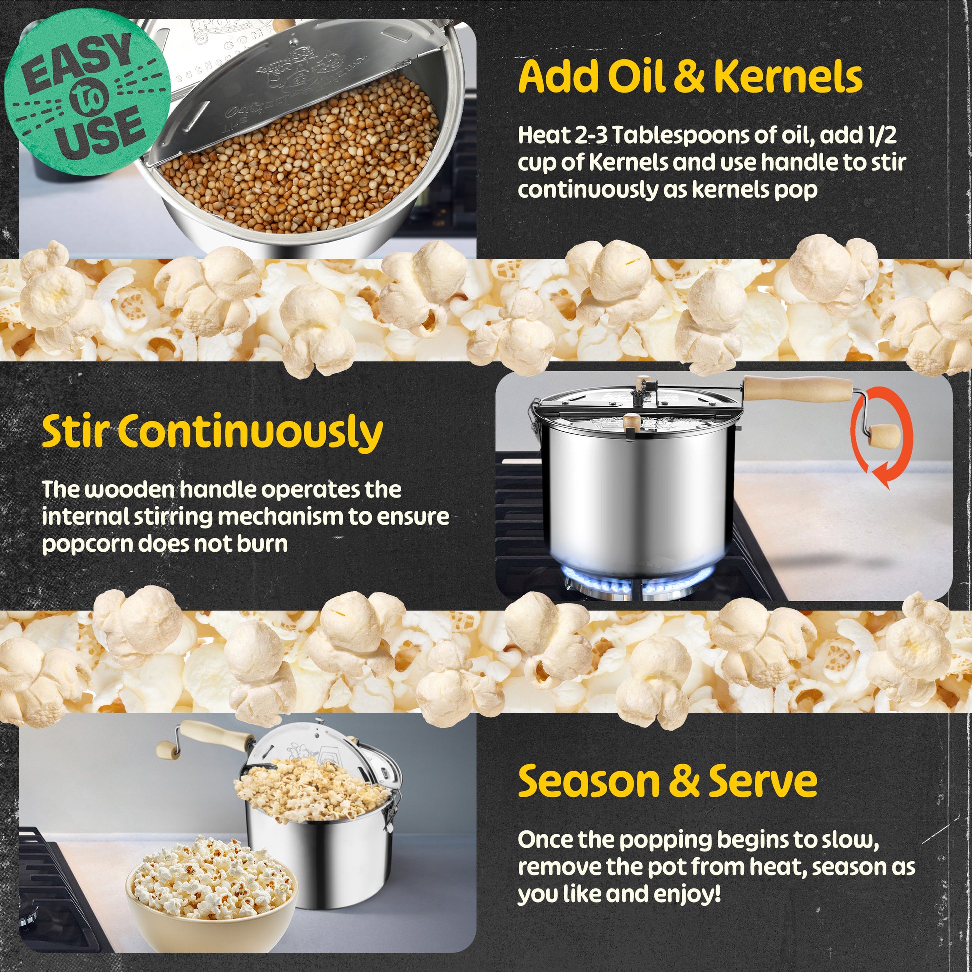 - Featuring a duplex heat pad for even cooking, the 6.5-quart stovetop popcorn maker makes up to 5-quarts of fresh popcorn within minutes for movie nights