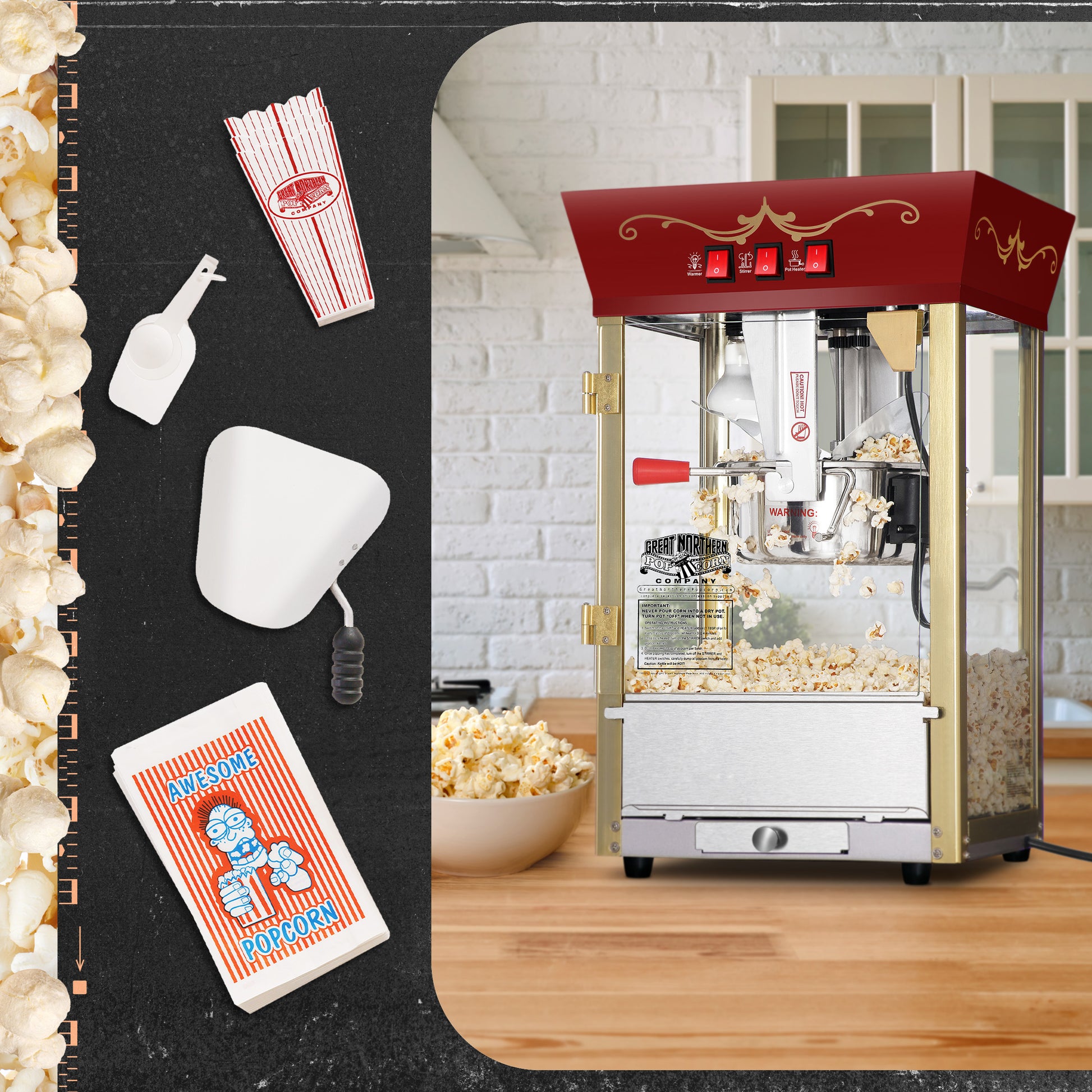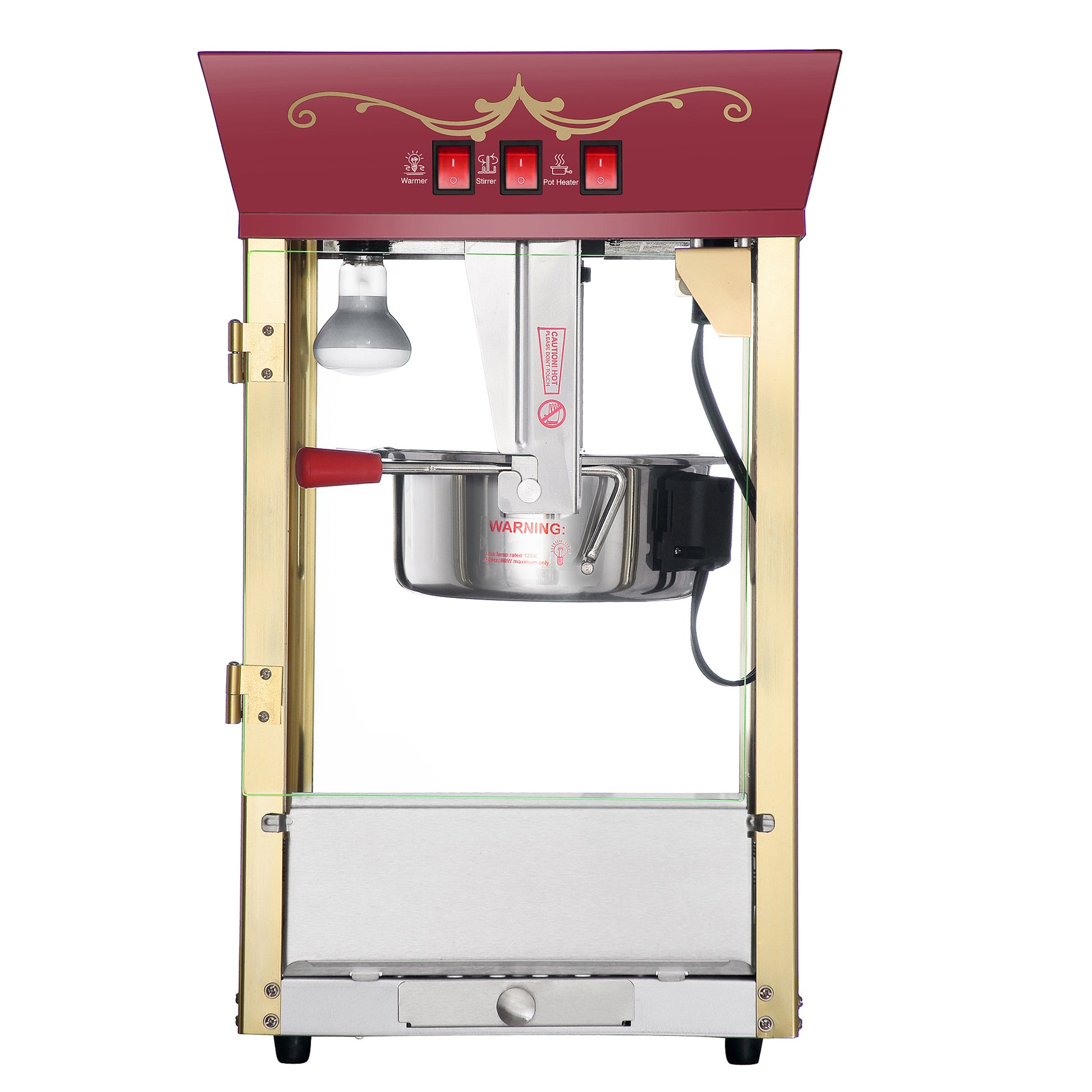 - The 3-switch design lets you use the kettle heater, stirrer, and warming light independently, popping up a tasty batch of everyone’s favorite salty treat in just minutes